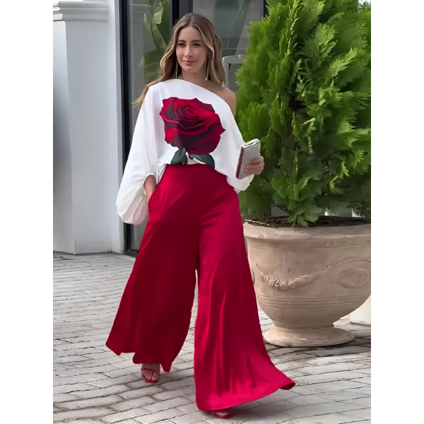 Opgrader dit look med blomstret sæt Liv, der består af en bluse med pufærmer og skrå udskæring samt brede bukser. Dette sæt er det perfekte valg for dem, der søger elegance med et moderne præg – ideelt til enhver lejlighed. Det rosa blomsterprint tilføjer charme, mens det højkvalitets materiale sikrer komfort og stil.